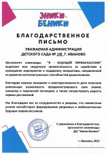 Благодарственное письмо от оргкомитета ДЦ "Эники-Беники" г.Иваново, 2025 за участие в олимпиаде "Я - будущий первоклассник".
